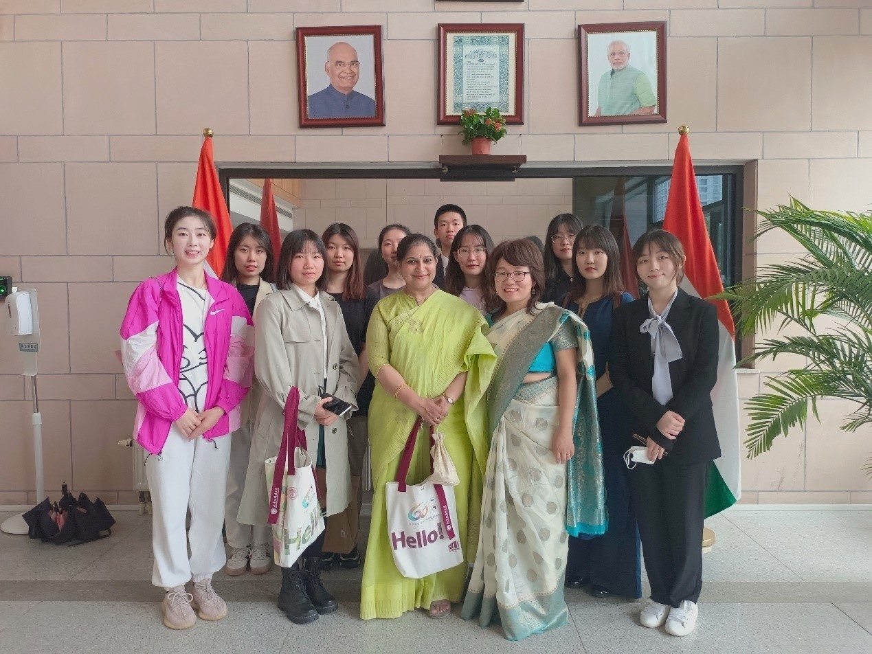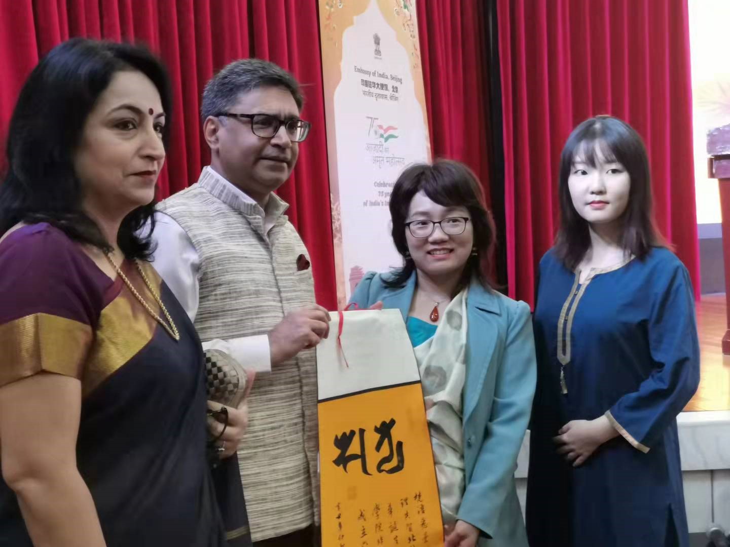 师生,参加由印度驻华大使馆在北京举办的“甘地诞辰日暨世界非暴力日”纪念活动。参加活动的有梵语巴利语教研室主任周利群副教授,印度社会文化古代方向的1名研究生,梵语巴利语和印地语专业的10名本科学生。